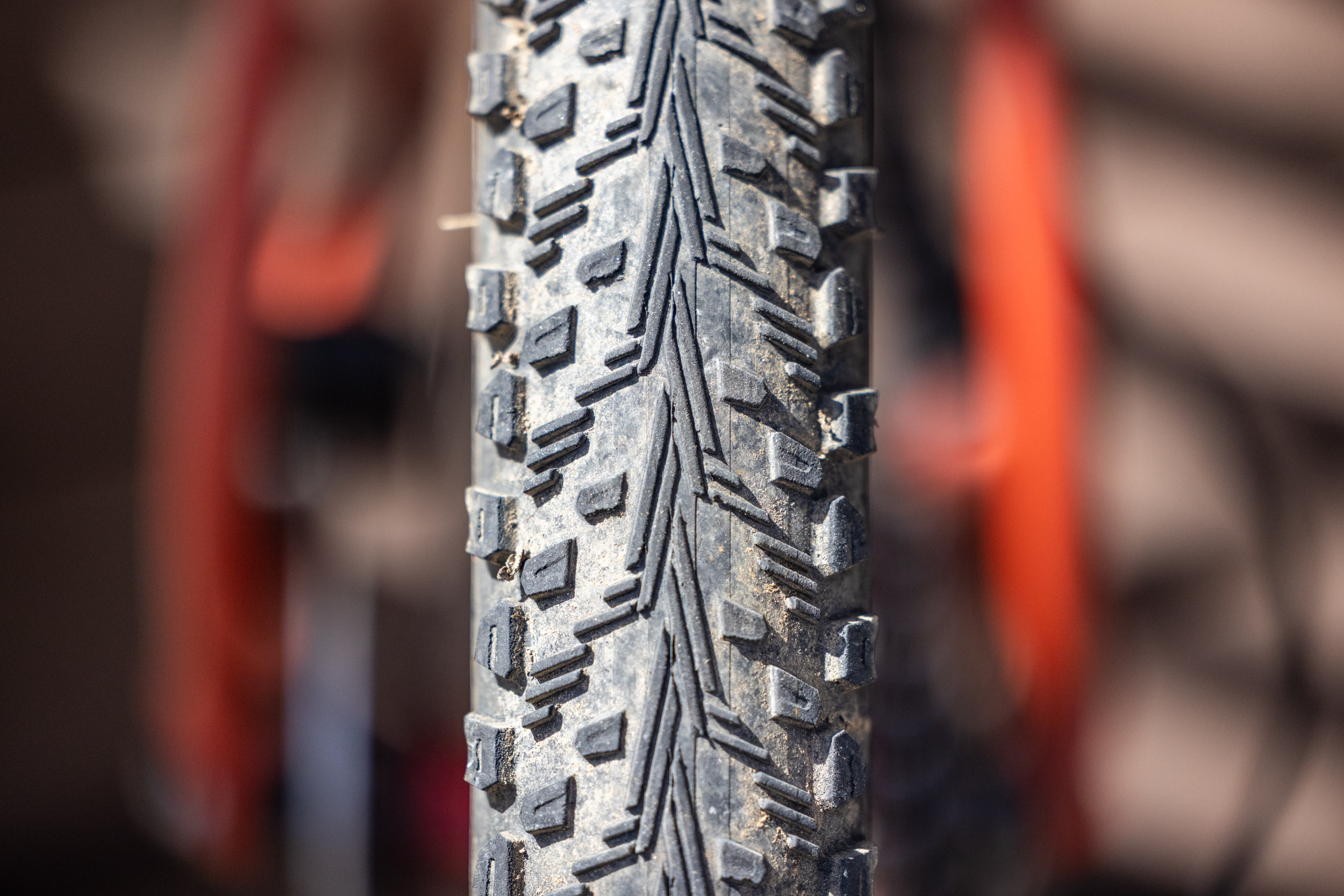יחד עם הדריכה המרכזית בצורת V, הפייוטים כוללים זיזים גדולים ומעט מאופקים בקצוות הצמיג. זיזי מעבר קטנים יותר מנקדים את החלל שבין קו המרכז הראשי לזיזי הקצוות, ויוצרים תבנית כיוונית מגוונת על פני השטח. זה לא שונה מדי מדפוסי דריכה אחרים שביליתי איתם הרבה זמן, כמו Teravail Rutland ו-Continental Race Kings. אבל האלמנט שעושה את ההבדל הגדול ביותר כאן הוא הדריכה המרכזית בצורת V. עם פחות גובה ויותר שטח פנים מאשר קווי דריכה מרכזיים אחרים, צורת ה-V היא משהו כמו חרב פיפיות. מניסיוני, הוא לא מתבלה מהר כמו קווי דריכה מרכזיים אחרים, והוא משיל בוץ ולכלוך מתמשך בצורה יעילה יותר מאשר עיצובים אחרים. עם זאת, האחיזה דרך מרכז הדריכה, במיוחד מאחור בעת האטה מהירה, אינה תואמת את זו של אפשרויות אחרות באותה קטגוריה.