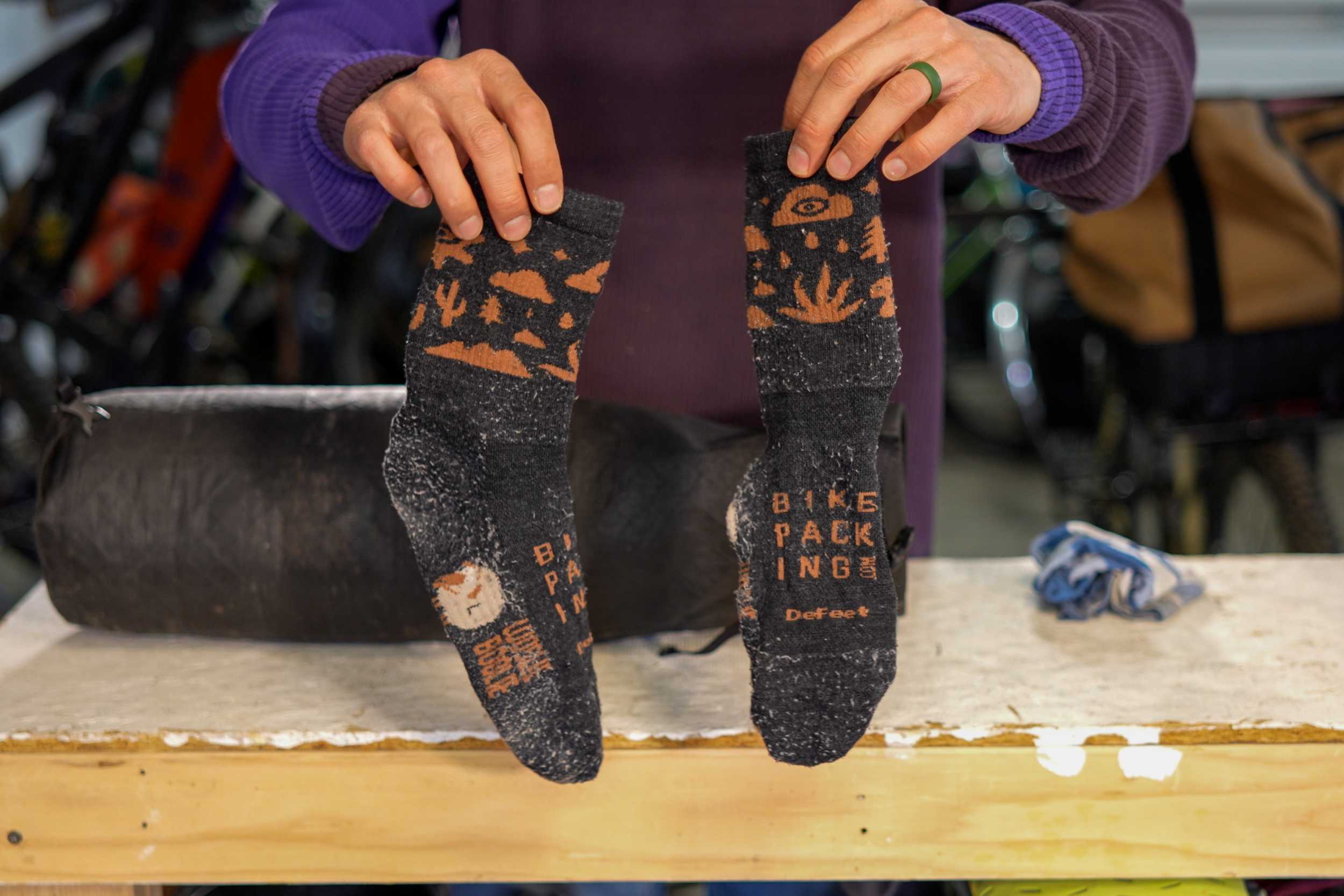 בנוסף לאמור לעיל, אני תמיד מביאה זוג גרביים נוסף לטיולים שלי. הם מוסיפים חום בלילה, נותנים לי להחליף גרביים מיוזעים, לבדוק את הרגליים ולחמם אותי קצת יותר בערבים קרים. אני נוטה להשתמש בהם ברוב הלילות, אלא אם כן זה ממש חם, כשאני יכול פשוט לתת לכלבים לנשום קצת. אלו הם ה-DeFeet Woolie Boolies מבית BIKEPACKING.com, אבל הגרסאות הלא מותאמות עובדות באותה מידה ועולות כ-25.99 דולר. זוג המידות הגדולות שיש לי שוקל 79 גרם.