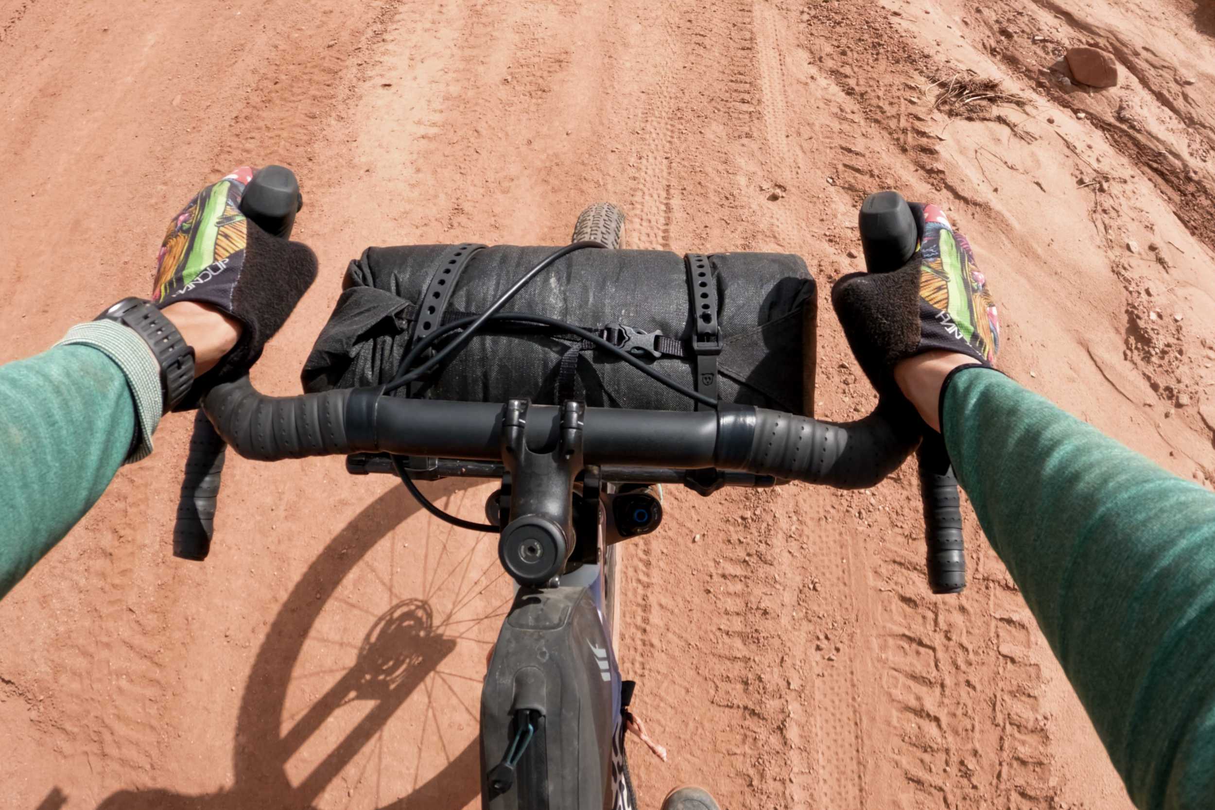 כולנו אורזים דברים שונים במערכת כידון. חלקם נושאים את ציוד השינה שלהם, בעוד שאחרים גוררים אוהל או מחנה חיוניים כמו אוכל. אחרים עשויים להשתמש באזור הקדמי של מערכת האחסון שלהם לציוד רטוב, כשהם נושאים את הציוד היבש שלהם מאחור. בדרך כלל, אני אורז אופניים באזורים שבהם אני יכול לארוז את האוהל שלי לתוך שק השינה שלי ולשמור את כל מערכות השכבות שלי מלפנים. עם זאת, אם יורד גשם ואני אצטרך לארוז את האוהל שלי כשהוא עדיין רטוב, אני אעביר שכבות כמו מעילי גשם ופריטים עמידים למים אחרים, או אפילו אוכל, עם האוהל, ואשמור על כל מה שבאמת צריך להישאר יבש במקום אחר. החיים באקלים מדברי בהחלט מקלים על חלוקת הציוד הזו, מכיוון שרוב אריזה האופניים שלי מתרחשת בתנאים יבשים.