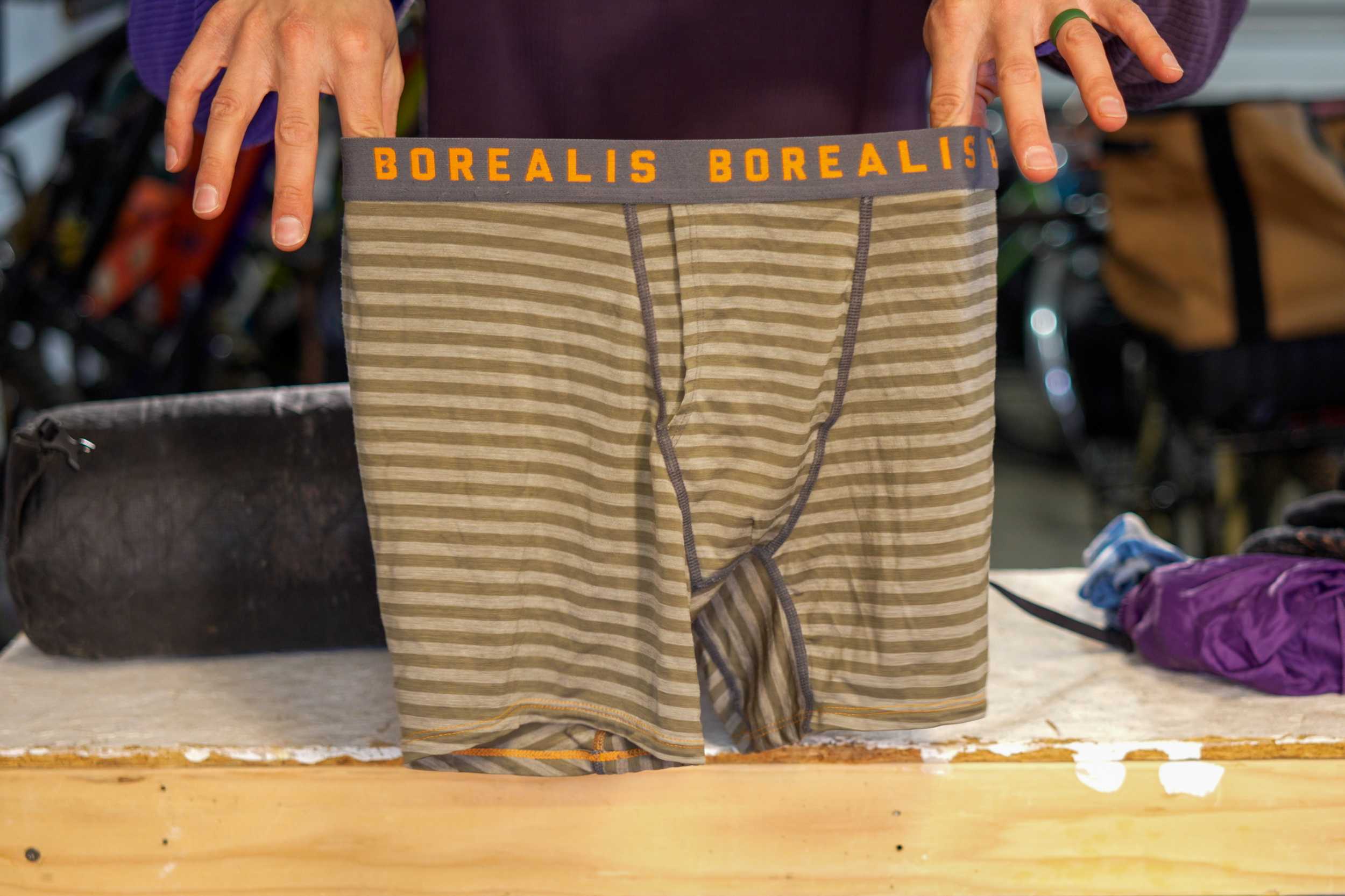 השגרה שלי עם ההגעה למחנה היא בדרך כלל כדלקמן. ראשית, הגדרתי את מערכת השינה שלי; כיום, זה בדרך כלל אוהל. אחר כך אני מחליפה את מכנסי הרכיבה שלי ולובשת זוג בוקסר צמר, ואחריו את מכנסי הרכיבה הקצרים שלי. המתאגרפים משמשים גם כשכבת רכיבה נוספת אם מתחילים להיות לי בעיות באוכף, אם כי לאחרונה אני די מרוצה מהאוכף שלי, ה-WTB Solano. הבוקסר שאני מפעיל כרגע הם בוקסר צמר בוריאליס במשקל 80 גרם, שעולים 60 דולר, אבל אתה יכול להשתמש כאן בכל מה שאתה רוצה. אני פשוט אוהב שיש להם תפרים בכל המקומות הנכונים.